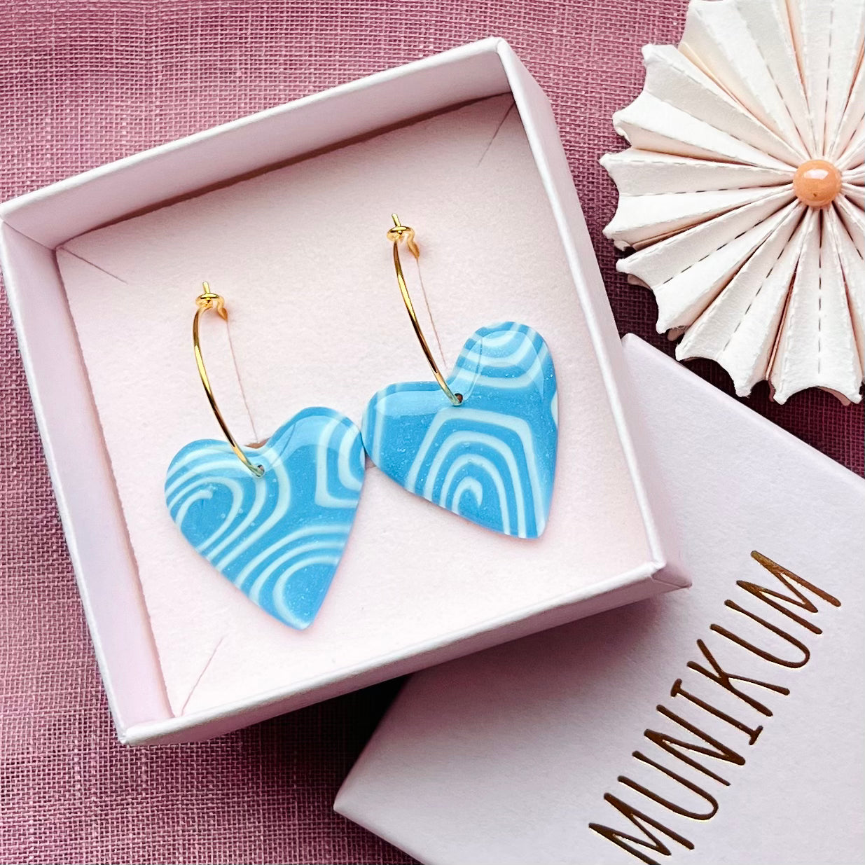Skinnende blanke hjerte-hoops med mønster i blå og hvid <3 One of a kind! Lakeret med resin.