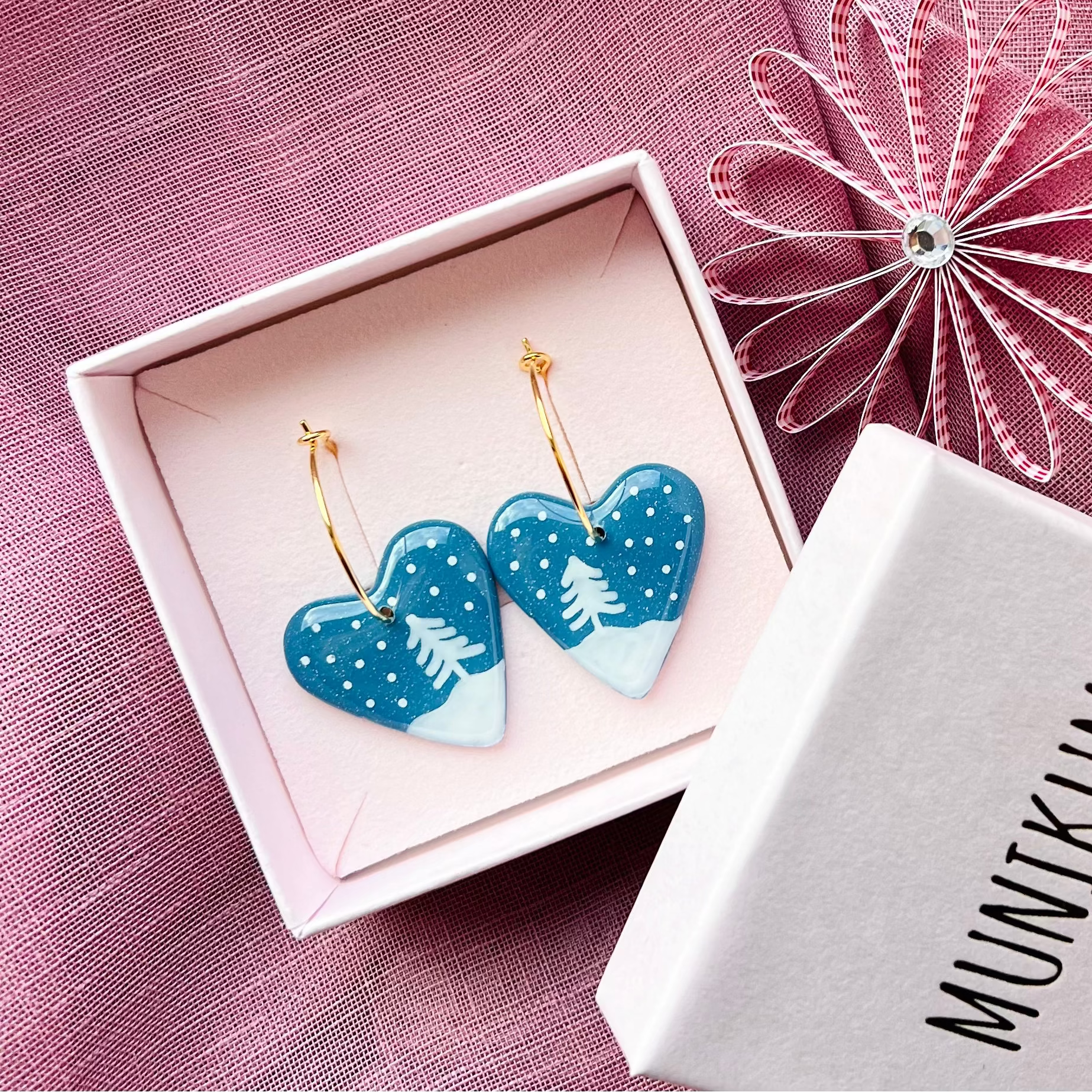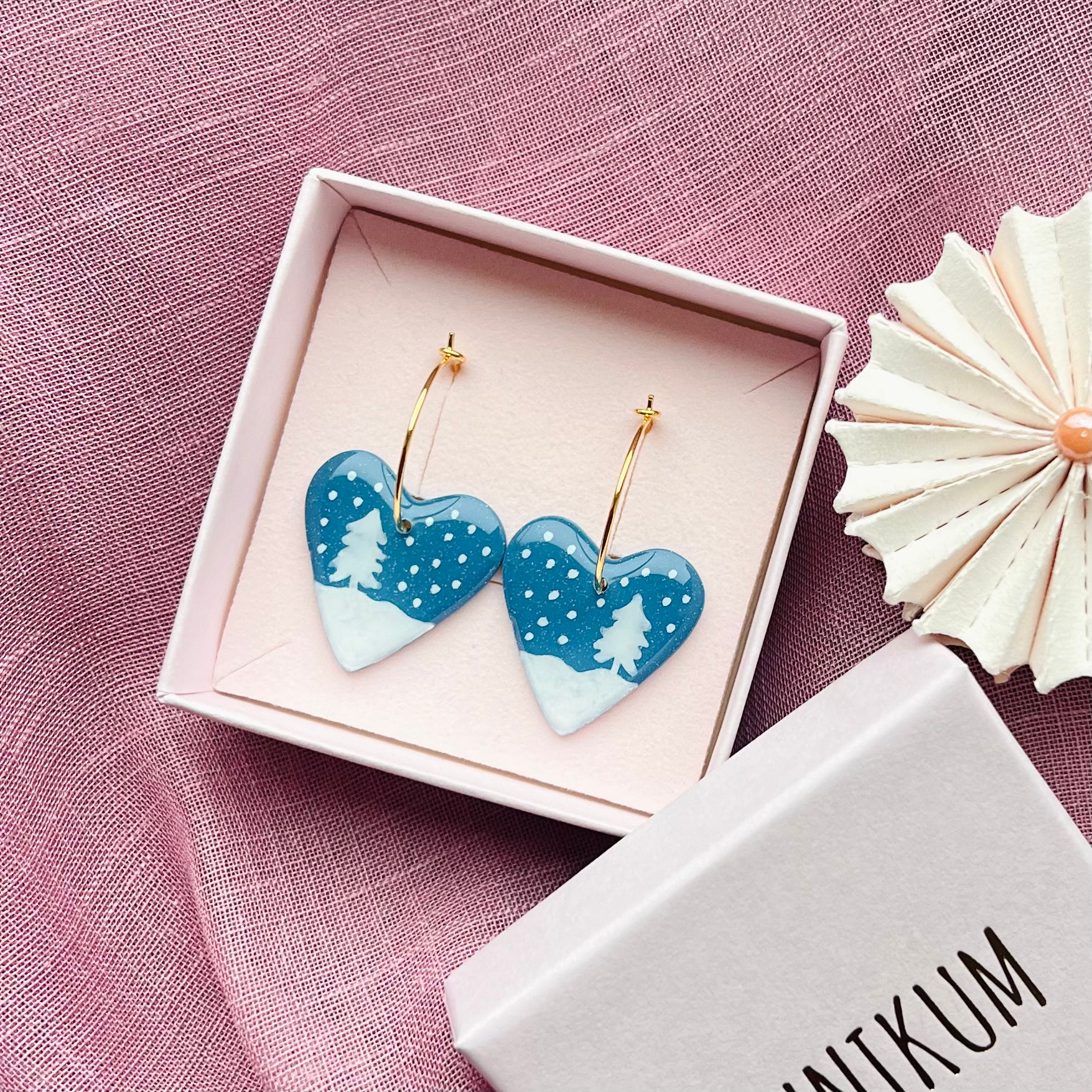 Skinnende blanke hjerte-hoops med håndmalede detaljer på en mørkeblå baggrund med glimmer <3 One of a kind!