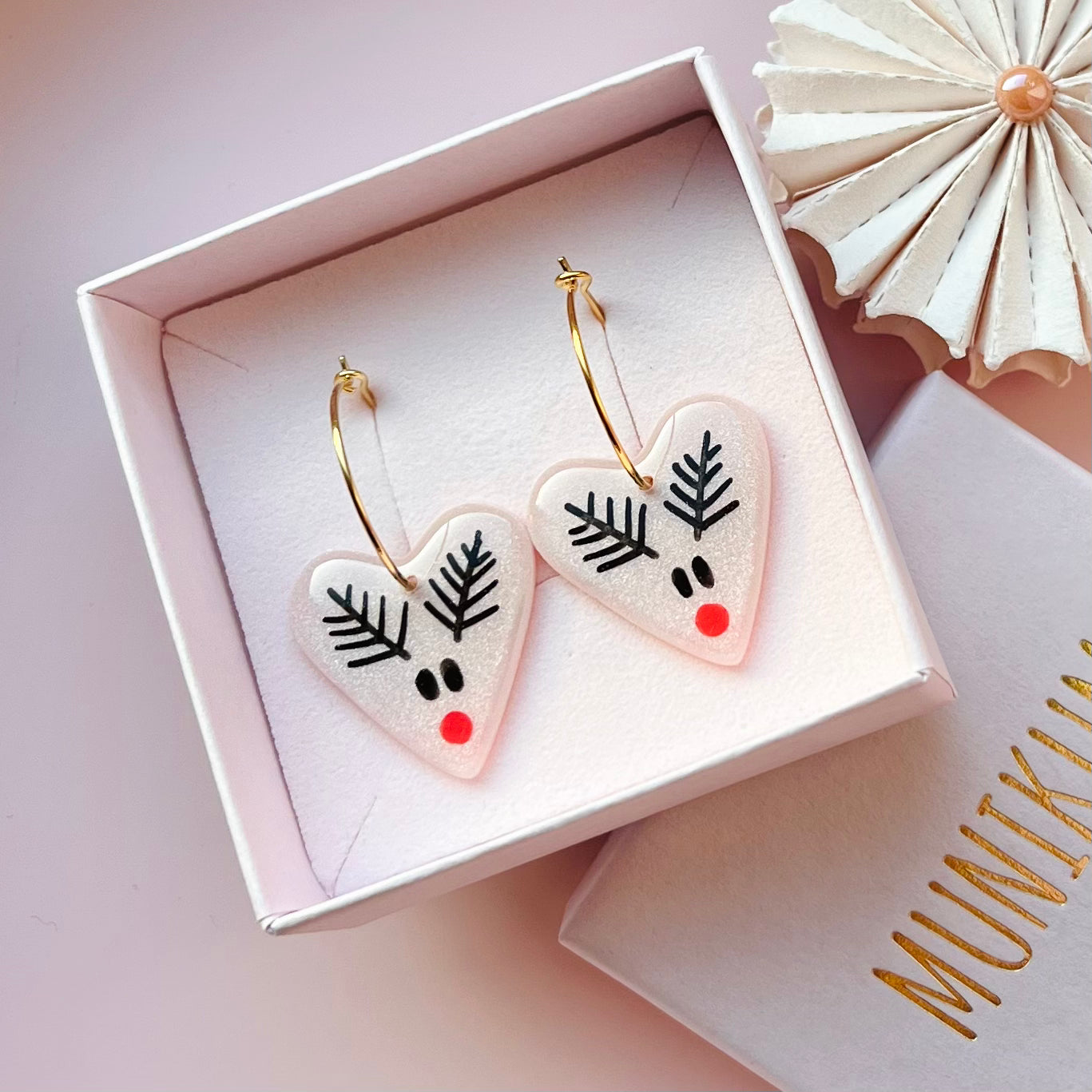 Skinnende blanke hjerte-hoops med håndmalede rensdyr på en lyserød baggrund <3