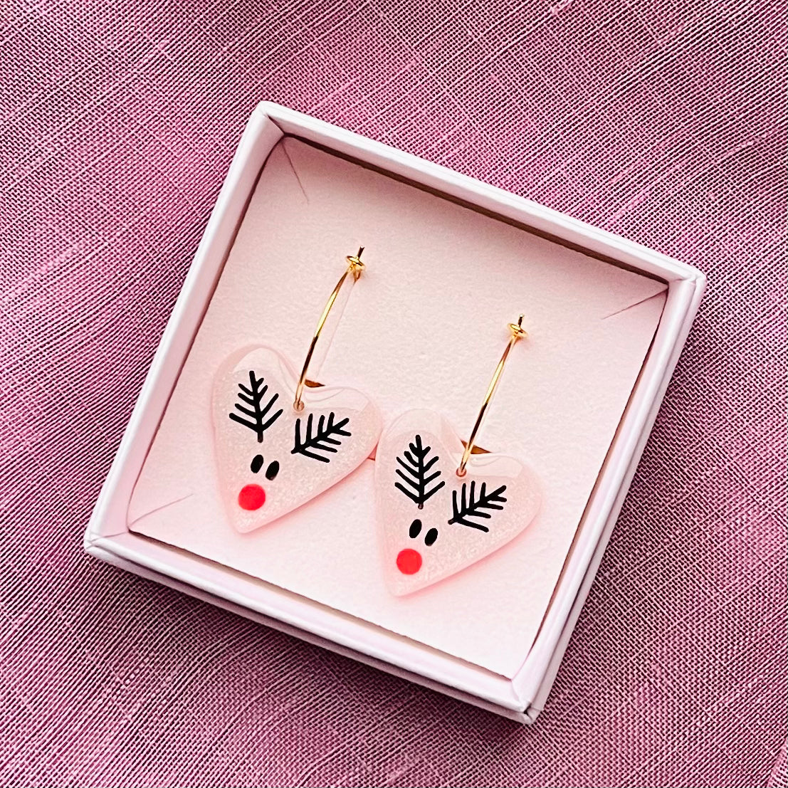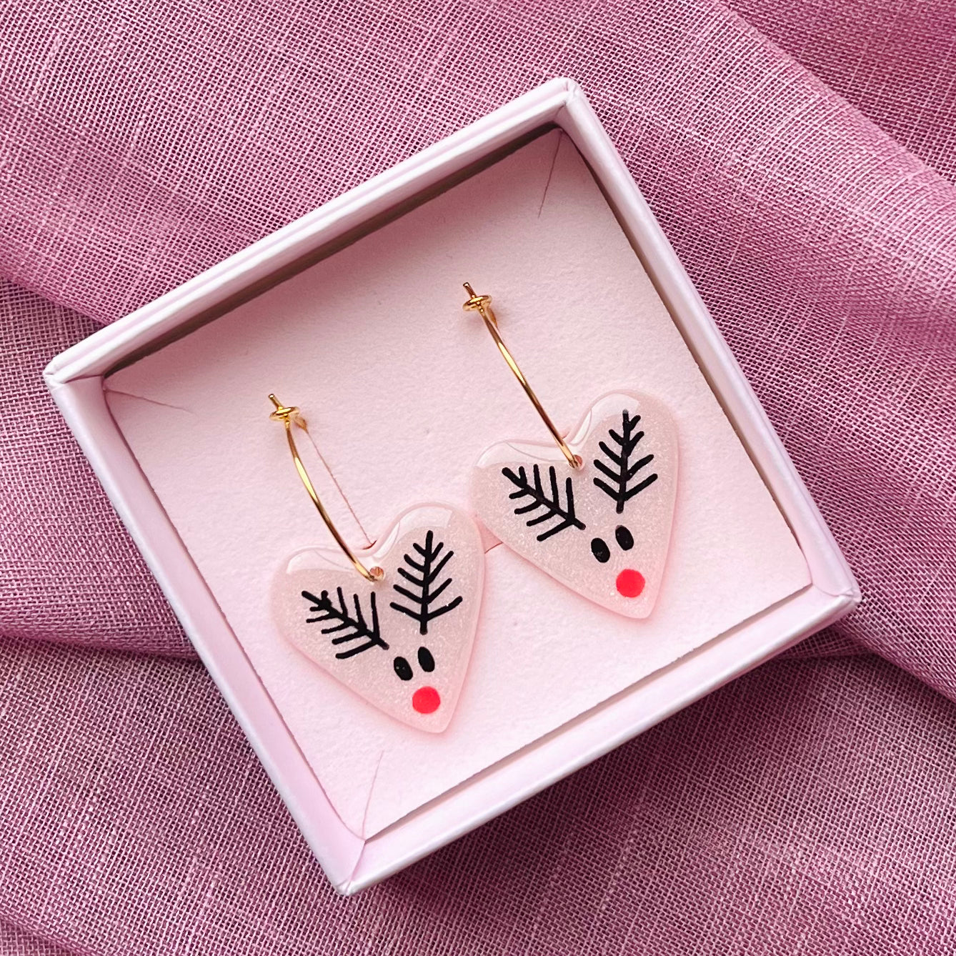 Skinnende blanke hjerte-hoops med håndmalede rensdyr på en lyserød baggrund med glimmer <3