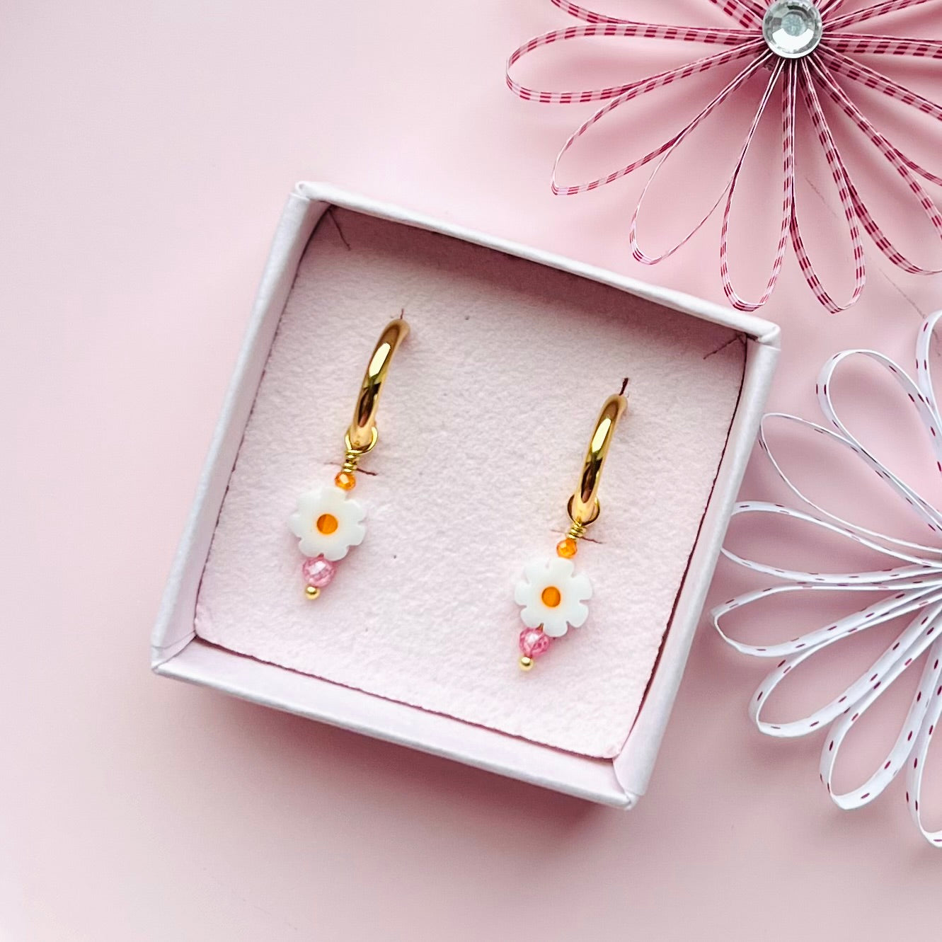Daisy-vedhæng med lyserød og orange zirkonia på elegante 12 mm chunky hoops <3