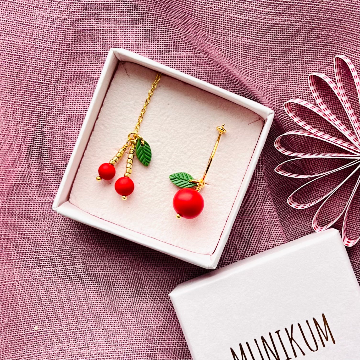 Håndmodelleret kirsebær og æble i cernit-ler <3 Kirsebærene er på kædeørering og æblet er 15 mm hoop.