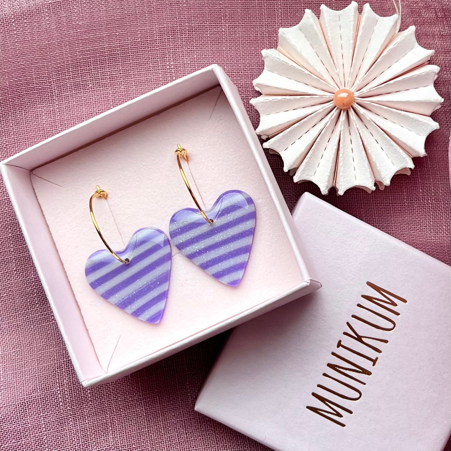 Blanke hjerte-hoops med marmoreringer røde nuancer <3