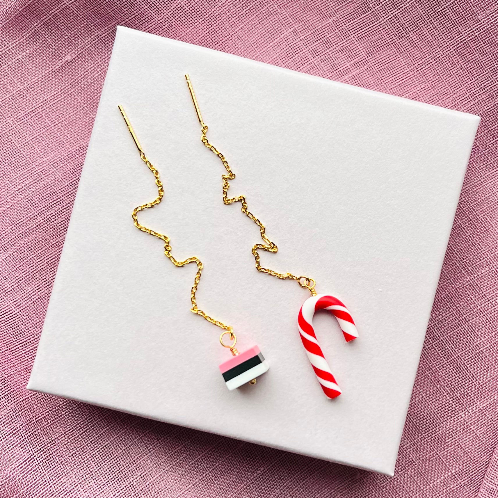 Håndmodelleret sukkerstok og lakridskonfekt på kædeøreringe <3