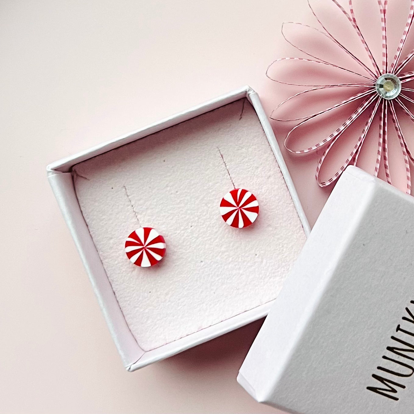 Fine små candy cane-ørestikkere, som sidder elegant og trygt på øret <3