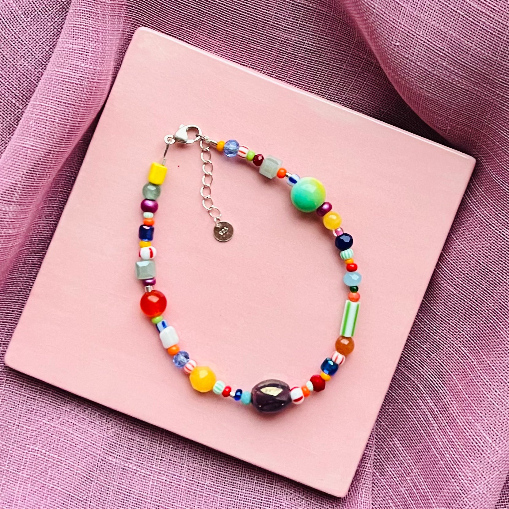 Skønt unika-armbånd med blandede perler og sten i glade farver.<3